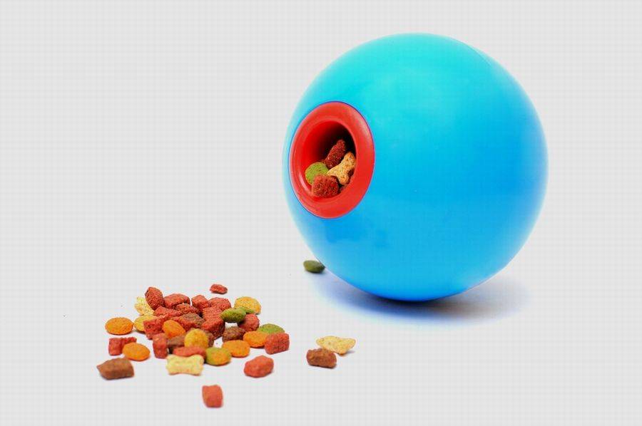 Игрушка для кошек дозатор еды в виде мячика. Кусочки сухой еды закладываются в полупрозрачный раскручивающийся мячик из двух половинок. Кошка гоняет мячик, тот вертится и из его отверстия выпадаю кусочки чего-то вкусного. Так вознаграждается физическая активность животного.