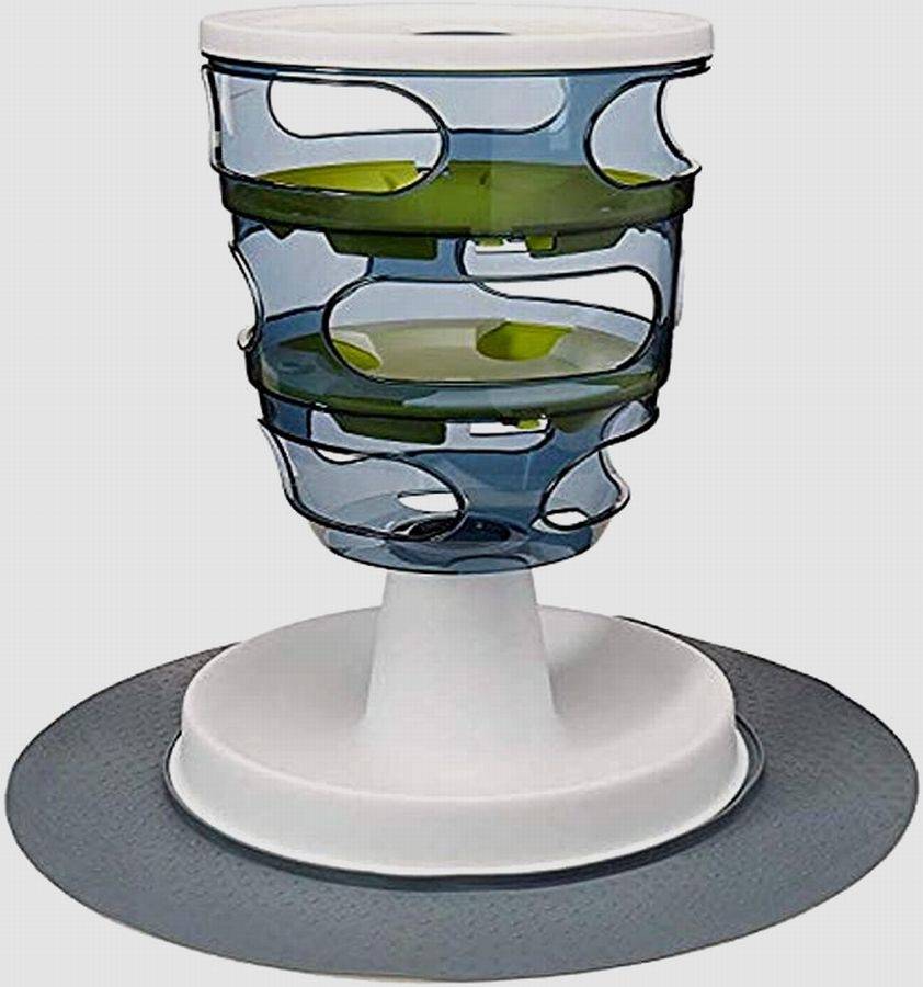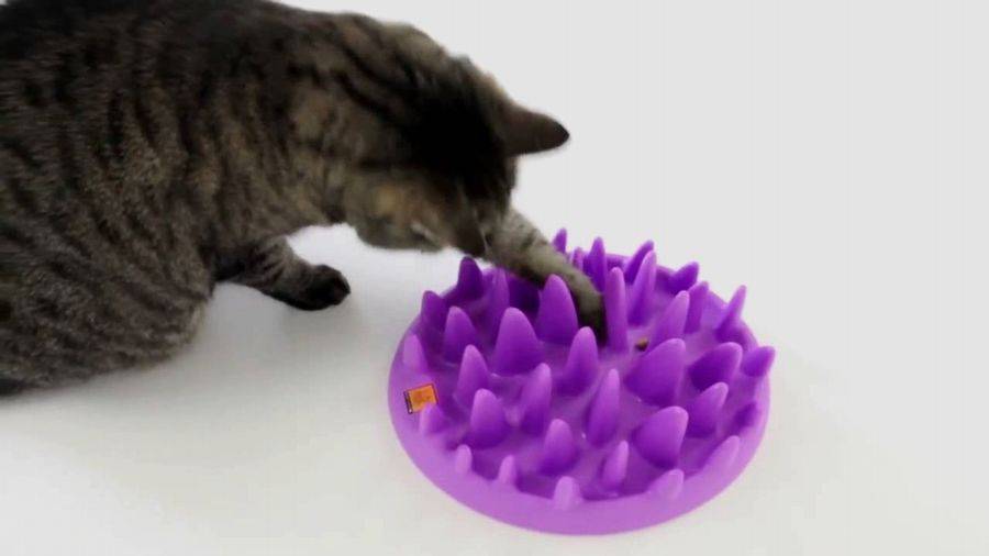 Интерактивная игрушка-кормушка для кошек в виде пластиковой миски, утыканной шипами-травинками. Между ними располагают кусочки корма, можно использовать влажный корм, а кошке придется приложить некоторые усилия, чтобы найти его и съесть. Кормушку можно мыть водой, можно в посудомоечной машине. Предохраняет кошку от ожирения, для получения еды нужно потратить хотя бы некоторое количество калорий.