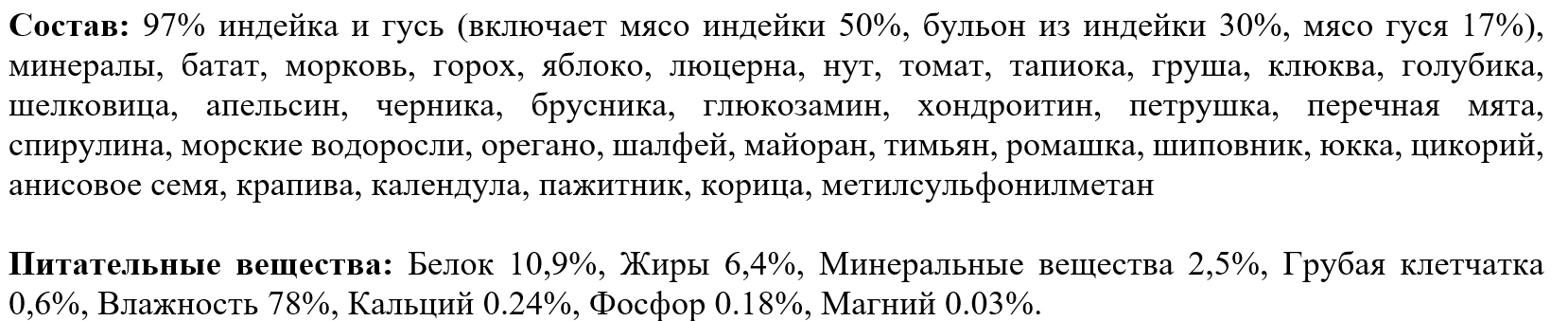 Отличается богатым натуральным составом: сладкий картофель, горох, морковь, яблоко, нут, томат, люцерна, груша, тапиока, клюква, апельсин, голубика, шелковица, брусника, черника. Глюкозамин и хондроитин – для здоровья суставов. Полезные травы и пряности: перечная мята, морские водоросли, петрушка, шалфей, орегано, цикорий, шиповник, ромашка, анис, календула, крапива, корица, пажитник, Юкка Шидигера. Обогащен кальцием, магнием и фосфором.