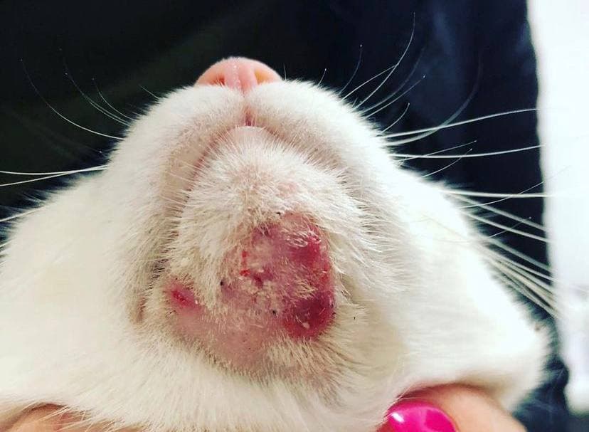 Более того, прилипание пятен к шерсти также повреждает волоски. Результат — воспаление кожи на подбородке кошки. Сначала он становится розовым и чувствительным на ощупь. Однако это может быстро развиться до такой степени, что кожа станет красной и чрезвычайно чувствительной. Кроме того, он вызывает зуд, поэтому, когда кошка чешет это место, появляются язвы.