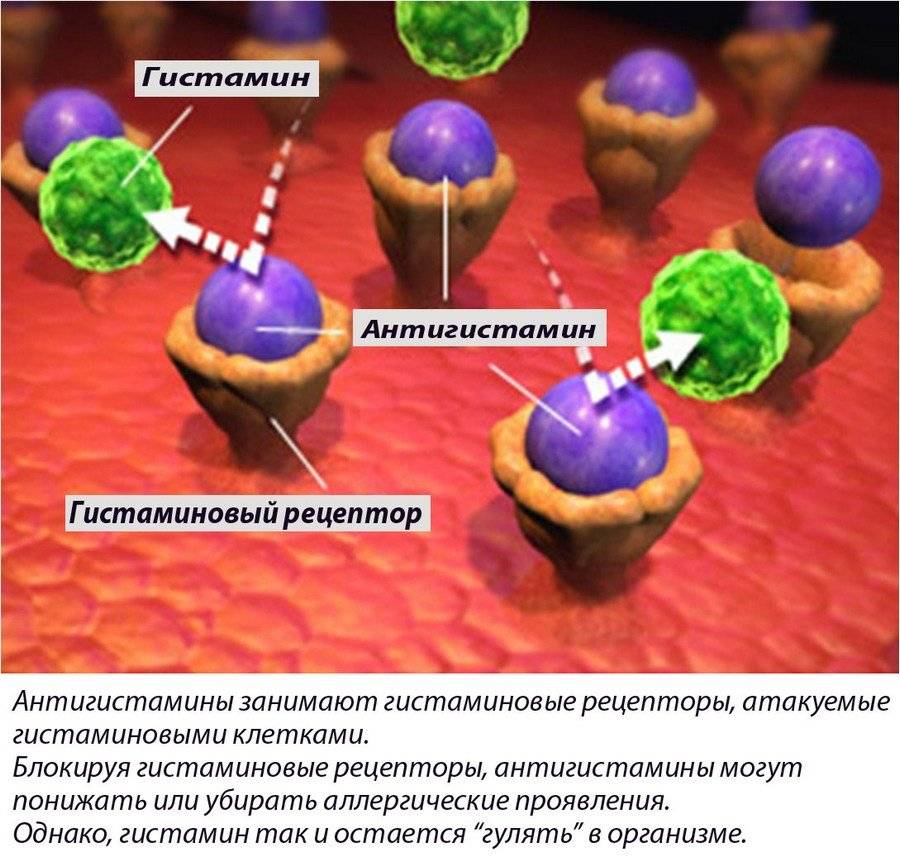 “А как же противогостаминные препараты?” – спросите Вы. В самом названии “антигистамины” содержится “уловка” производителей, – препараты не устраняют гистамин в организме, – они всего лишь блокируют гистаминовые рецепторы, которые отвечают за реакцию на повышенный уровень гистамина в крови. Таким образом, приняв таблеточку, мы просто устраняем симптомы (и то не всегда), но не убираем причину, – гистамина как было избыточно много в организме, так и осталось (см. рис. справа).