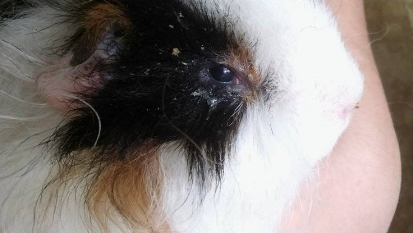 - Болезни глаз. Гноится глаз у свинки обычно при конъюнктивите. Можно заметить, что питомец прищуривается, боится света, у него опух глаз, текут слезки и гной, появляются корки на веках. Если инфекция распространяется на мордочку, то развивается хейлит. Лечение назначает ветеринар, исходя из причины конъюнктивита. При травме роговицы развивается кератит. Роговица мутнеет, у грызуна ослабевает зрение. Терапия осуществляется антибиотическими каплями. Иногда можно заметить белые выделения из глаз у свинки. Это слезки. Зверек подвергся стрессу, испугался и плачет.