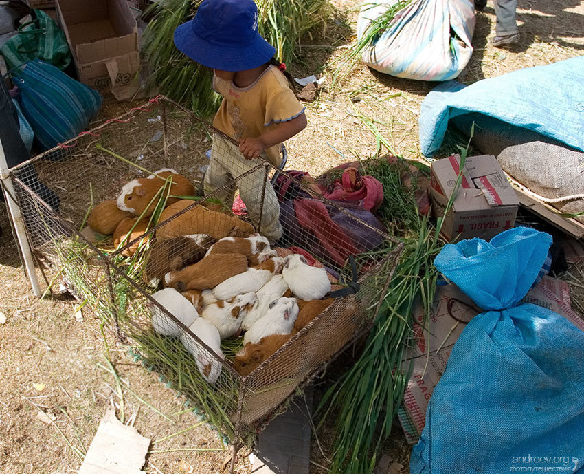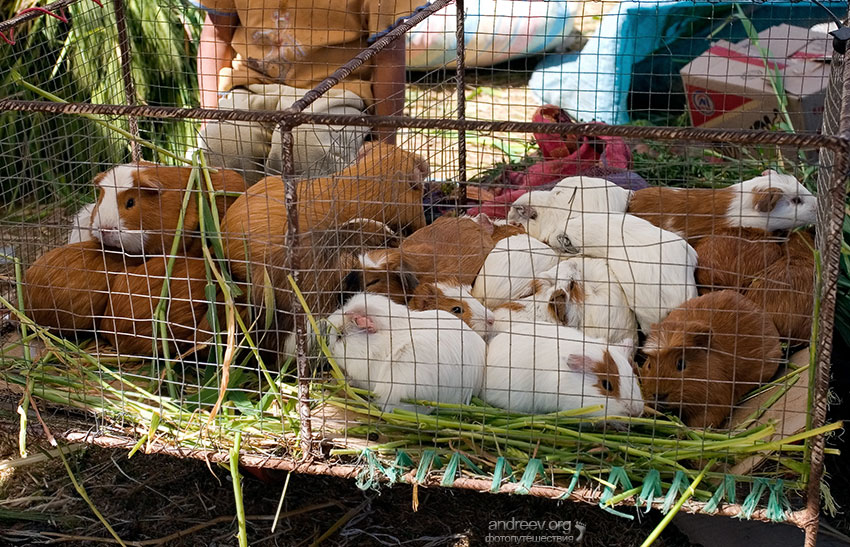 Вернее, даже совсем не ценный. Почти неприлично звучащим по-русски словом “куй” (“cuy”) в Перу называют морских свинок, разводимых с гастрономической целью еще с до-инковских времен. Многие современные крестьяне, живущие в Андах, выращивают куев наравне с курицами, свиньями, и прочими овцами. Их мясо богато белком, в кормежке неприхотливы, размножаются как кролики, да еще и места почти не занимают – идеальное для разведения животное!