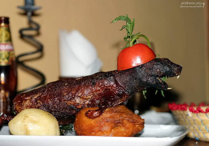 А вот так выглядит зажаренный куй, подающийся в одном из ресторанов Куско. У Инков даже была поговорка: “Raise guinea pig – eat well” (“вырастил куя = хорошо поел”). В год перуанцы потребляют около 22 миллионов куев. Цена в ресторане – от 20 до 50 солей, в зависимости от места ($1=3 солям). На вкус очень похоже на кролика. Готовят куя просто: натирают солью, перцем, поливают pisco (перуанский алкогольный напиток), и запекают на барбекюшнице, или жарят в большом количестве масла.