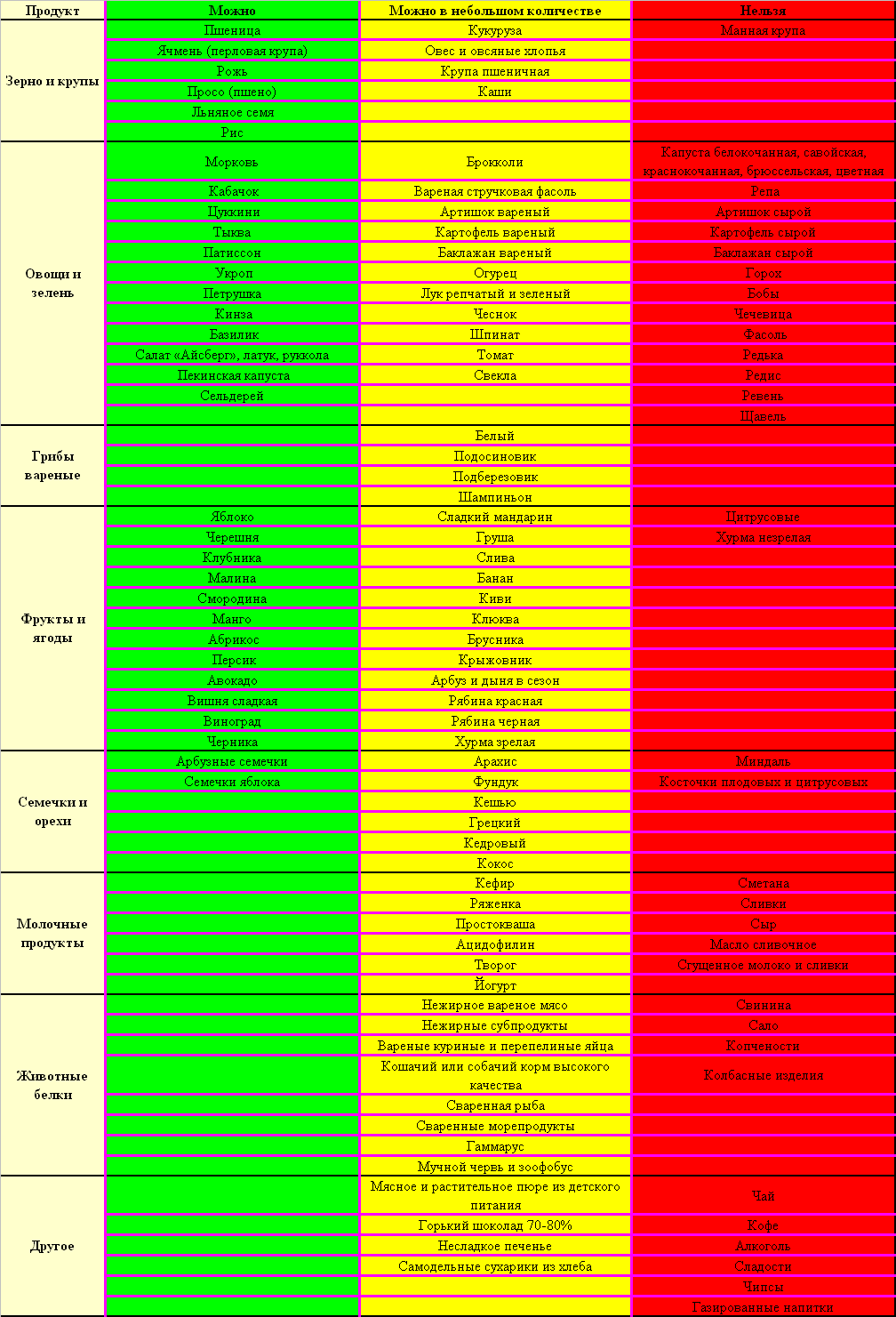 Под табу падают все те же продукты и виноград. Все виды косточек и огурцы. Даже изюм полностью запрещен.