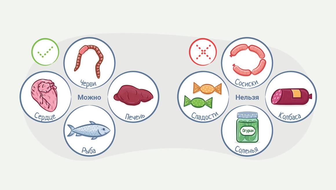 Маленьких особей угощают мясными продуктами не часто, а взрослых особей, примерно 1-2 раза в неделю.