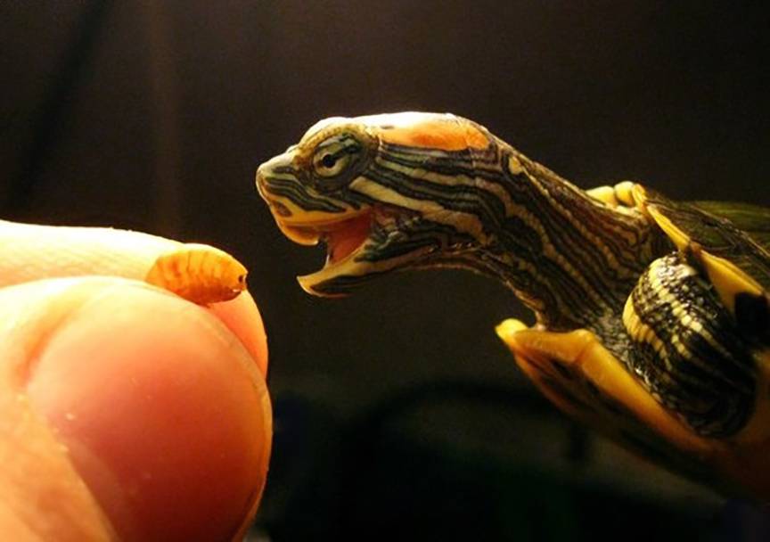Взрослым красноухим черепахам можно давать тараканов, дождевых червей, тонко нарезанное мясо. Маленьким красноухим черепахам – мотыль и речных рачков. Раз в одну-две недели можно давать говяжью печень.