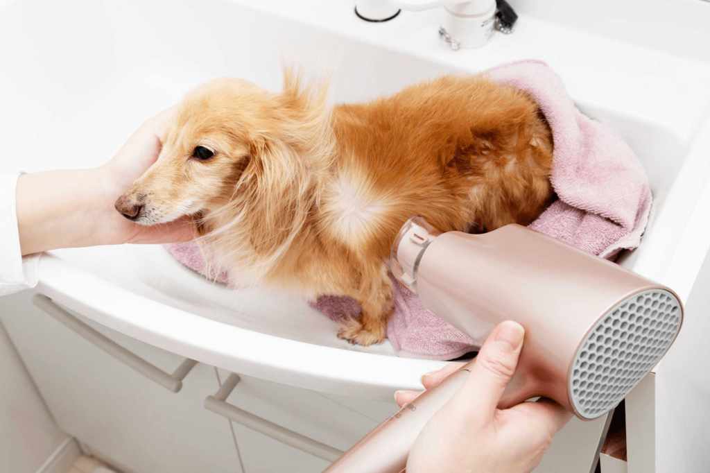 - При высушивании собаки с помощью фена, расческой ведут против роста волосяного покрова, это предотвратит образование кудрей, наличие которых затрудняет процесс стрижки.