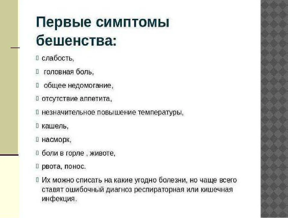 | Физический осмотр | Врач осматривает рану от укуса животного, проверяет наличие лихорадки и других симптомов бешенства |