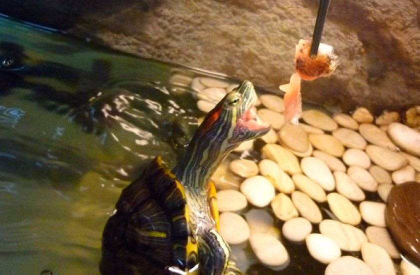 Крупные взрослые водяные черепахи нуждаются в сыром или отварном мясе курицы или в постной говядине. Изредка можно подкормить водного экзота проваренным в течение пары минут филе морской рыбы.