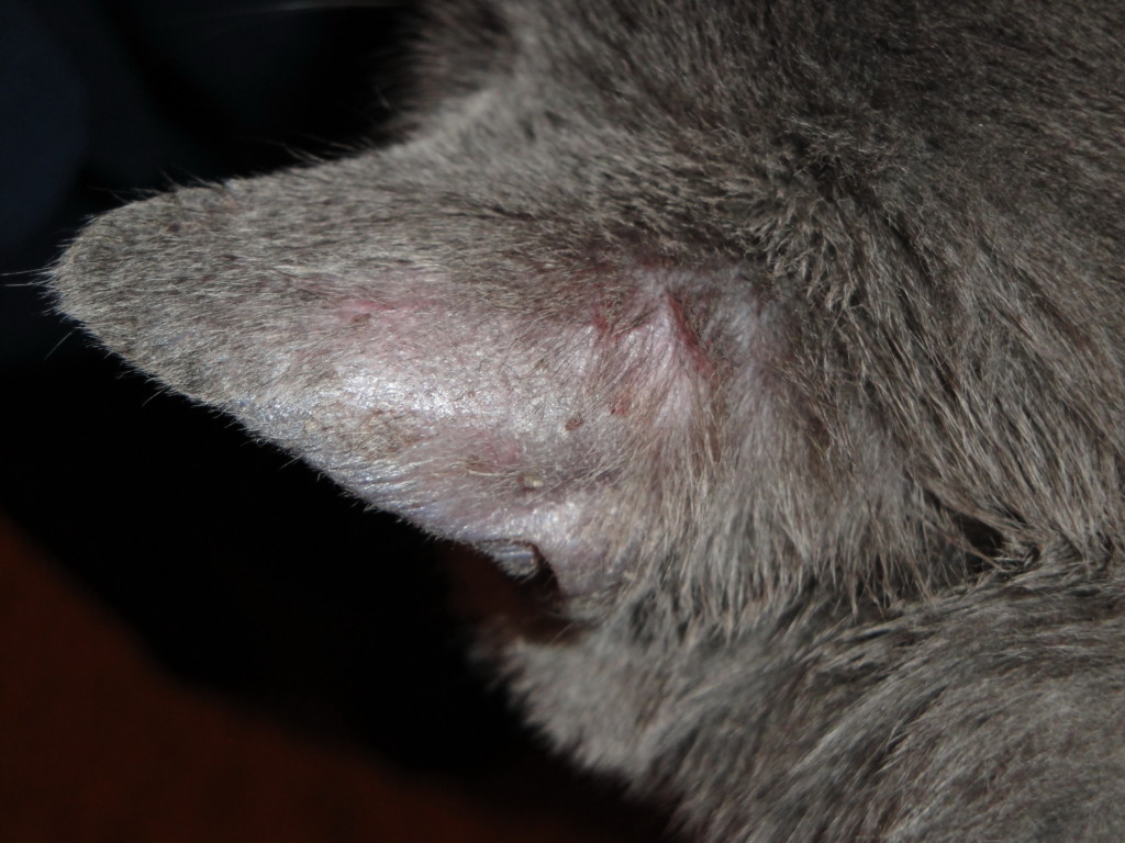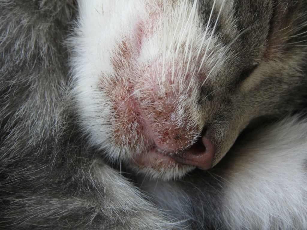 Другое название этого заболевания — миллиарный дерматит у кошек. Главный признак — покраснение и сыпь на пораженных участках тела в виде узелков, папул, пузырьков, везикул.