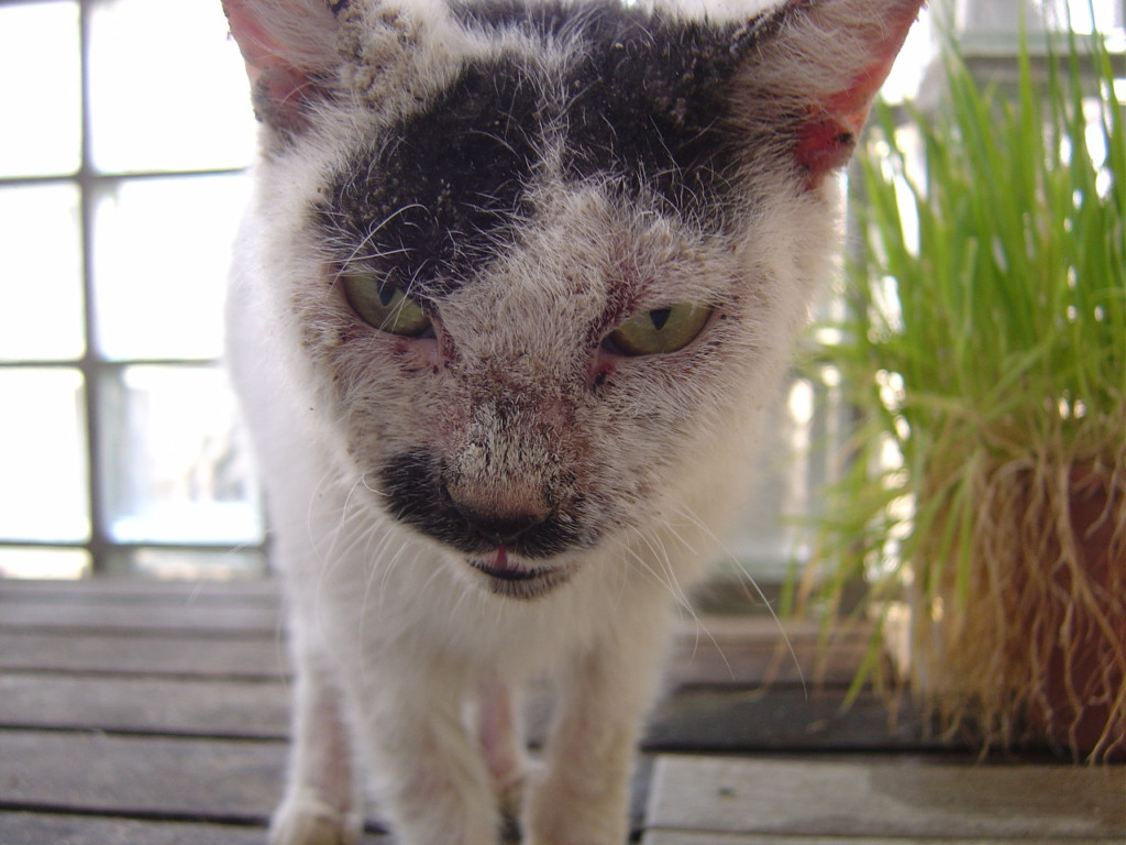 Аллергию может спровоцировать любой продукт, новый или привычный для кошки (т.н. накопительная реакция), натуральный или входящий в состав готовых кормов. Пищевой дерматит проявляется кожными высыпаниями, зудом различной интенсивности, отеками. Реакция может возникать сразу после попадания аллергена в ЖКТ или быть отсроченной на несколько часов, реже – дней. На фото – тяжелый случай запущенного пищевого дерматита: