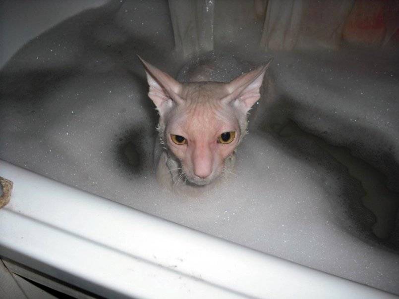 Странно – но девончики любят купаться. Их кудрявая шерстка быстро становится грязной и липкой, поэтому к купаниям котенка нужно приучать с детства.