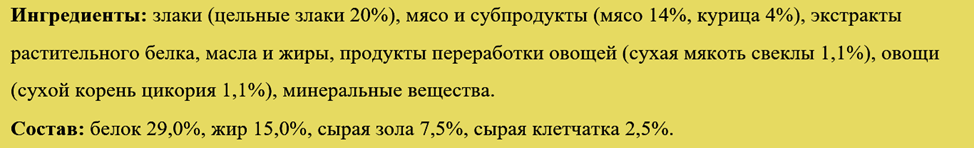 Мясо (не вполне понятно какое) занимает 18% от массы рациона. О качестве и количестве субпродуктов неизвестно, они лишь упоминаются. Такая трактовка рецепта кормосмеси позволяет производителю манипулировать ингредиентами. А это – второй аргумент против причисления продукта к премиум-классу. Под туманным определением «экстракты растительного белка» могут маскироваться кукурузный глютен или соевый шрот.