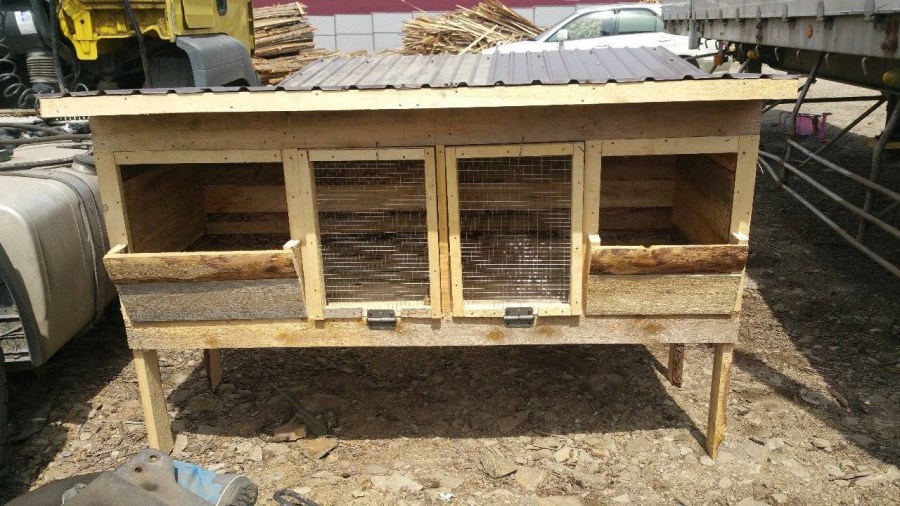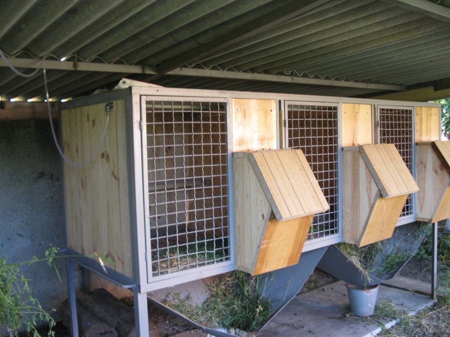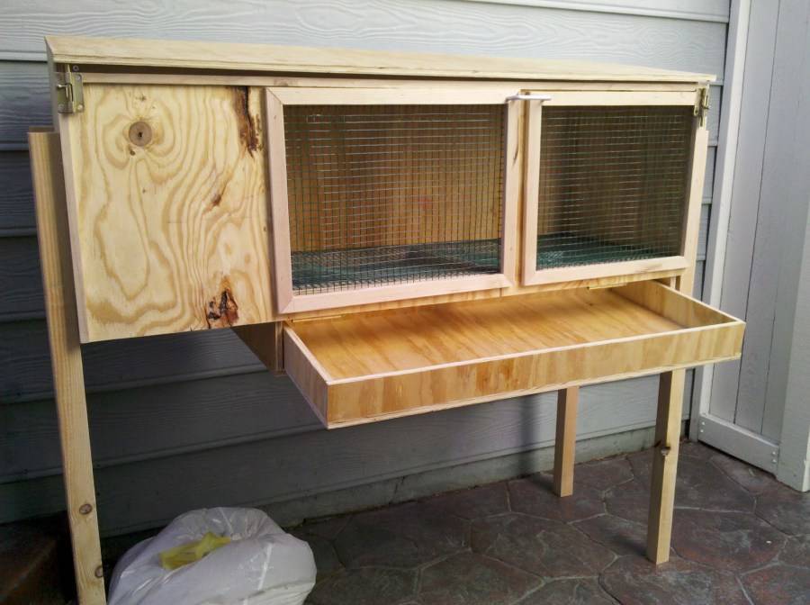 Самая простая деревянная клетка для кроликов представляет собой клетку с деревянным каркасом, стоящую на опорах. Внутри с помощью фанерных листов делают перегородки, создавая таким образом помещения для отдыха, кормления и уборную. В домике обязательно должно быть отверстие для выхода в вольер. Кролики должны иметь возможность выйти на свежий воздух в любой момент.