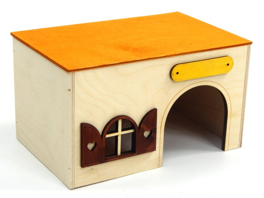 Для постройки обычного одноэтажного жилища из дерева вам понадобится 4 квадратных доски одинакового размера из обработанного дерева или фанеры. На одной из них необходимо сделать большое отверстие, и 1-2 поменьше, соответственно, дверь и окна. Далее доски соединяют между собой с помощью специального нетоксичного клея или гвоздей и молотка таким способом, чтобы животное не могло пораниться. Крышу можно смастерить с помощью ещё двух досок, соединенных под углом 45 градусов или сделать плоской, что даст возможность животному забираться на нее и обозревать обстановку.
