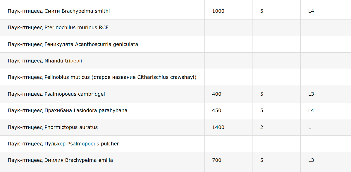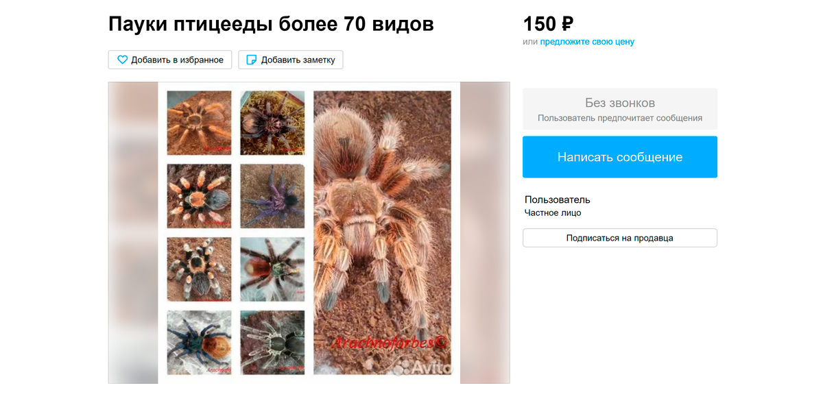 Купить паука-птицееда можно и на «Авито». Здесь продаются и взрослые особи, и маленькие паучки, и даже яйца пауков. Стоимость тоже сильно разнится, я нашла животных и за 150 Р, и за 11 000 Р. Но отмечу, что высоких цен пугаться не надо: за несколько тысяч рублей продают, скорее всего, паука вместе с террариумом.
