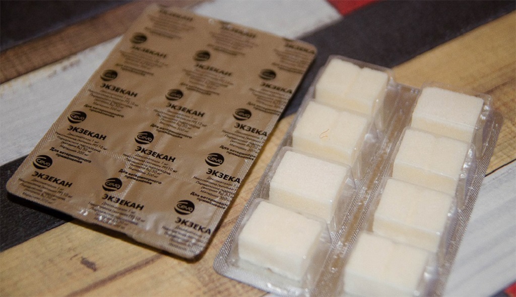 Мне как-то приходилось применять Экзекан, и я столкнулась с небольшой проблемой — кубик никак не хотел растворяться в обычной воде. Жидкость с плавающими кусочками лекарства так и пришлось выбросить. Второй кубик я раздавила ложкой, добавила в чуть тёплую воду и при интенсивном размешивании лекарство почти растворилось. Позже наш ветеринар посоветовал давать брикеты без воды (например, положив кубик в мисочку с сухим кормом). Но этот способ испробовать я так и не успела (кот выздоровел).