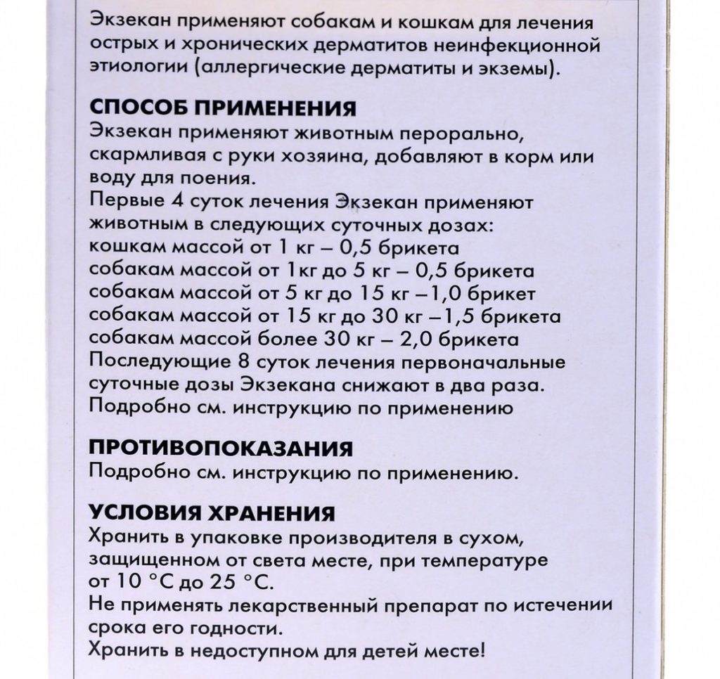 Изначально Экзекан разрабатывался как противоаллергическое средство для собак (eczema – экзема, canis – собака), поэтому его дозировка рассчитана на крупных животных. Впоследствии это лекарство стали применять для лечения кошек, однако питомцам с небольшим весом его лучше не давать.