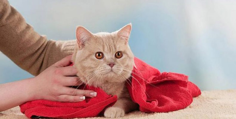 По окончании процедуры кошку следует поднять и слегка «отжать», осторожно прикасаясь к шерсти и хвосту. Замотать в полотенце и вытереть как можно тщательнее