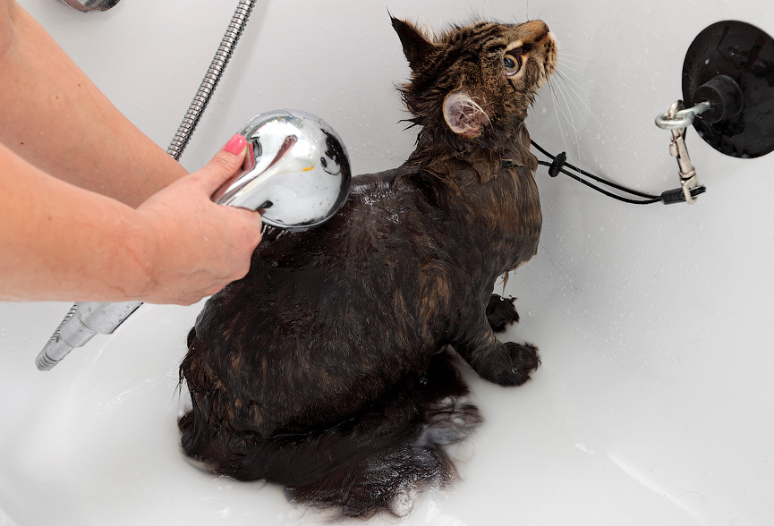Напор воды не должен быть слишком сильным, ее температура должна быть такой же, как вначале. Кошки любят очень теплую воду, поэтому даже самые неуступчивые пригреваются и перестают сопротивляться.