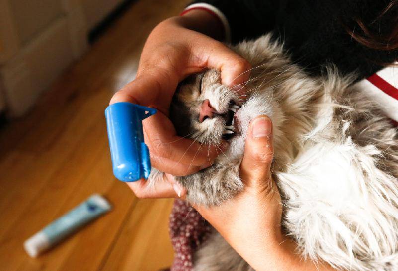 Коту необходимо дать время, чтобы познакомиться с новыми предметами, он должен их обнюхать, попробовать на зуб. К началу чистки питомец должен быть сытым и спокойным, пребывать в хорошем расположении духа. Пасту наносят на щетку так, чтобы она была не только на поверхности, но и в глубине, иначе кошка сразу слижет ее. Кота сажают к себе спиной и приоткрывают пасть. Чистку начинают с задних зубов и постепенно переходят к передним, обрабатывая как внешнюю, так и внутреннюю сторону.