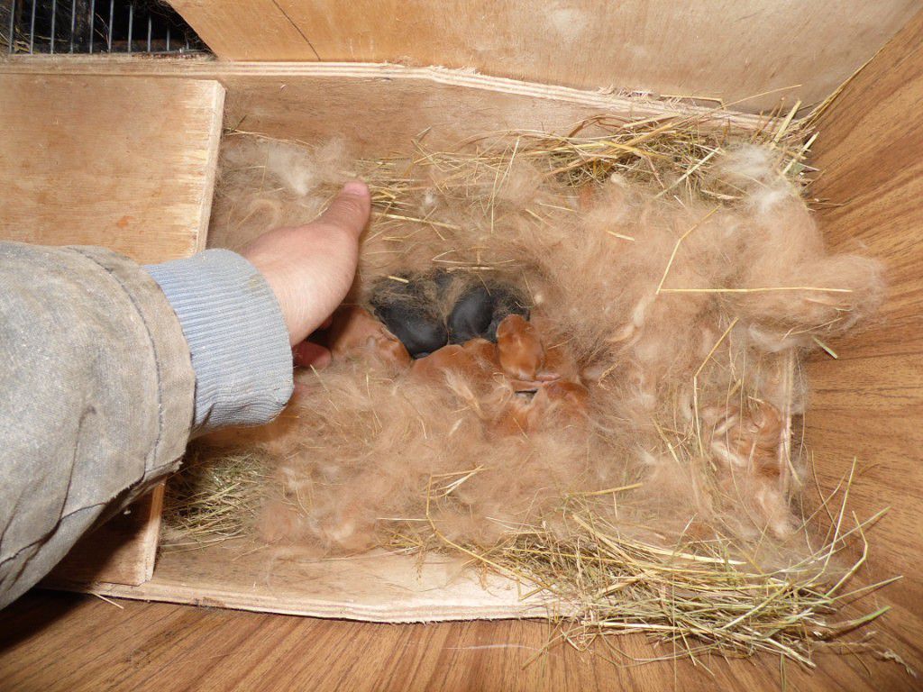 Крольчата очень легко появляются на свет. Самочка удобно располагается в своем гнезде и начинает подготовку к окоту. Крольчиха садится таким образом, чтобы после появления малышей на свет можно было сразу их вылизать. Когда крольчата появляются из родовых путей, они располагаются между задними лапками самочки. Слепые и лысые, они появляются задними лапками вперед. Когда все кролики рождены, крольчиха поглощает послед и начинает вылизывать новорожденных. Помощь фермера при окоте не нужна – самка все сделает самостоятельно.