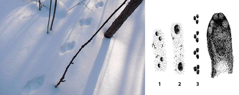 Следы соболя на снегу обычно не четкие, заметить и распознать их может не всяких охотник. По размеру отпечатка они не уступают лисьим следам, а при движении трехчеткой (3) по своему характеру напоминают заячьи.