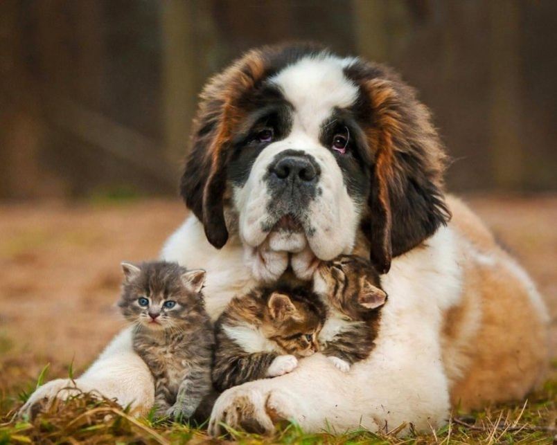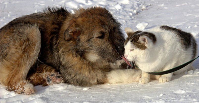 К счастью, животные не руководствуются в своей жизни стереотипами и крепкая дружба между ними возможна. Любители животных могут привести множество примеров, когда эти животные спят вместе, вылизывают друг друга, защищают и даже нянчат малышей другого вида.