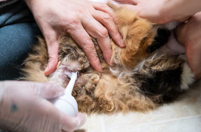 Наконечник клизмы, предварительно смазанный вазелином, очень медленно вращательными движениями вводится в анальное отверстие. Максимальная глубина введения 3-5 см, после чего клизма коснется спрессованных каловых масс. Постепенно содержимое спринцовки или шприца выпускается в тонкую кишку, а задний проход зажимается собственным хвостиком животного. Следует уговорить питомца подождать пару десятков минут, чтобы все фекалии растворились и с легкостью вышли из кишечника. В это время нужно аккуратно массировать его животик в области таза раскрытой ладонью, что будет способствовать лучшему распределению лекарственной жидкости в брюшной полости.