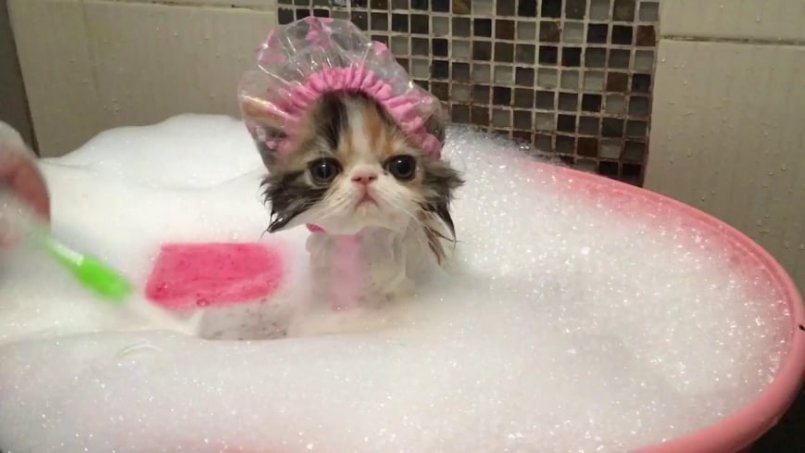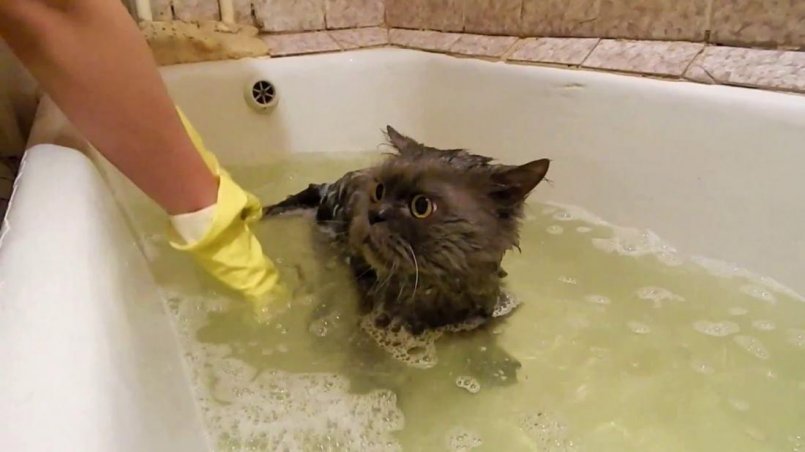Важно проявлять терпение и применять имеющиеся знания. На видео мытья кошек можно видеть процесс купания уже практически приученного к воде питомца