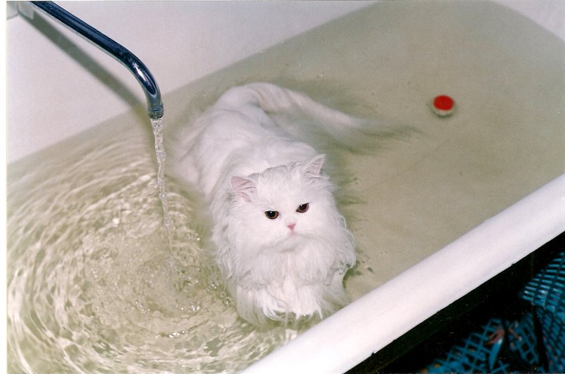 После того, как все подготовлено, можно переходить к водным процедурам. Если для кошки купание происходит в первый раз, то лучше мыть кошку вдвоем. Один человек придерживает кошку за спину и лапы, второй человек осуществляет процедуру.