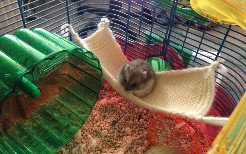 При наличии навыков вязания можно сделать гамак для питомца из плотной пряжи. В качестве инструмента при этом используются спицы или вязальный крючок. Такое изделие вяжется быстро, но не отличается долговечностью — если активный хомяк прогрызёт в нём отверстие, то всё полотно расплетётся.
