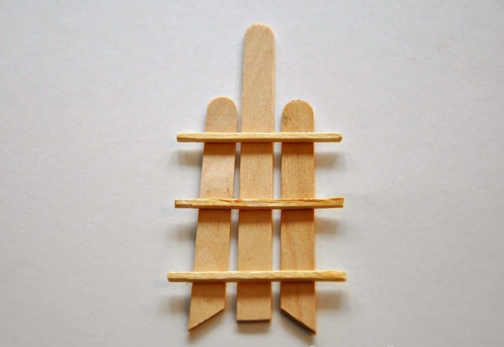 Две загнутые палочки приставляются друг к другу концами, чтобы образовался полукруг. Место их соединения снизу закрепляется посредством приклеивания третьей. Те же манипуляции проделываются с тремя другими загнутыми палочками. В результате получились две арки – это опоры будущего моста. Оставшиеся прямые палочки приклеиваются на эти параллельно размещенные арочные основы как перекладины мостика.