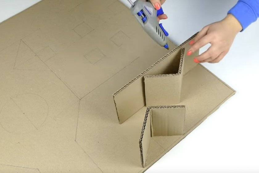 Высоту стен лабиринта сделайте 13–15 см, вырежьте заготовки для стен. Также ножом по карандашной разметке вырежьте детали внутреннего убранства лабиринта, в некоторых из них нужно не забыть сделать отверстие для туннеля, если вы его запланировали. Высота у них такая же, как у внешних стен. Из готовых деталей с помощью клеевого пистолета соберите части лабиринта.