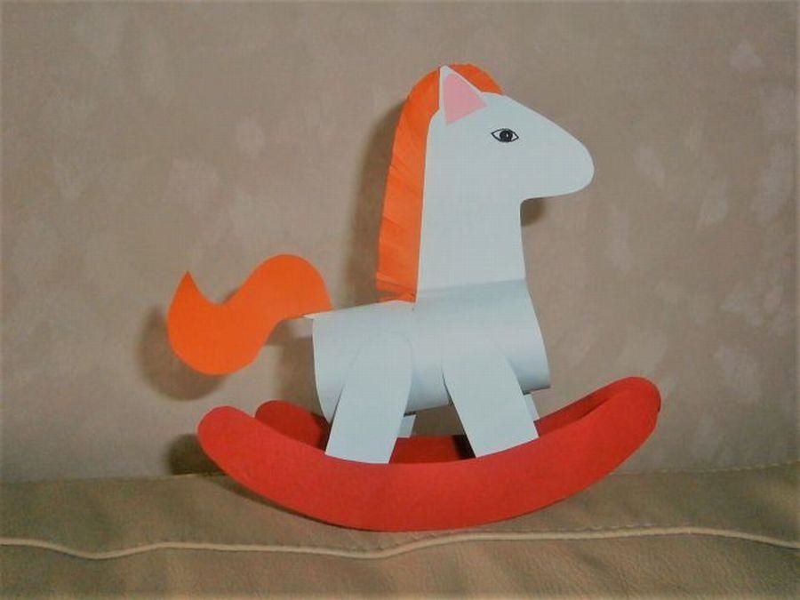 Такая версия лошадки качалки считается самой простой и интересной. Детям точно понравится её делать, так как в неё нет никаких сложностей. Достаточно свернуть «туловище» в трубу и склеить. Отдельно вырезать подставку, которая будет качаться.