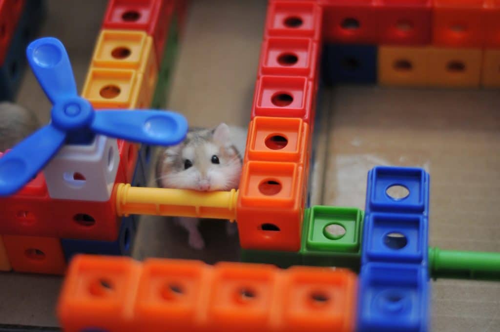 Среди преимуществ лабиринта из конструктора — возможность быстрой измены маршрута. За считаные секунды можно переставить несколько деталей, и хомяку придётся заново прокладывать оптимальный путь. Стимулирование к мыслительной деятельности пойдёт на пользу животному.