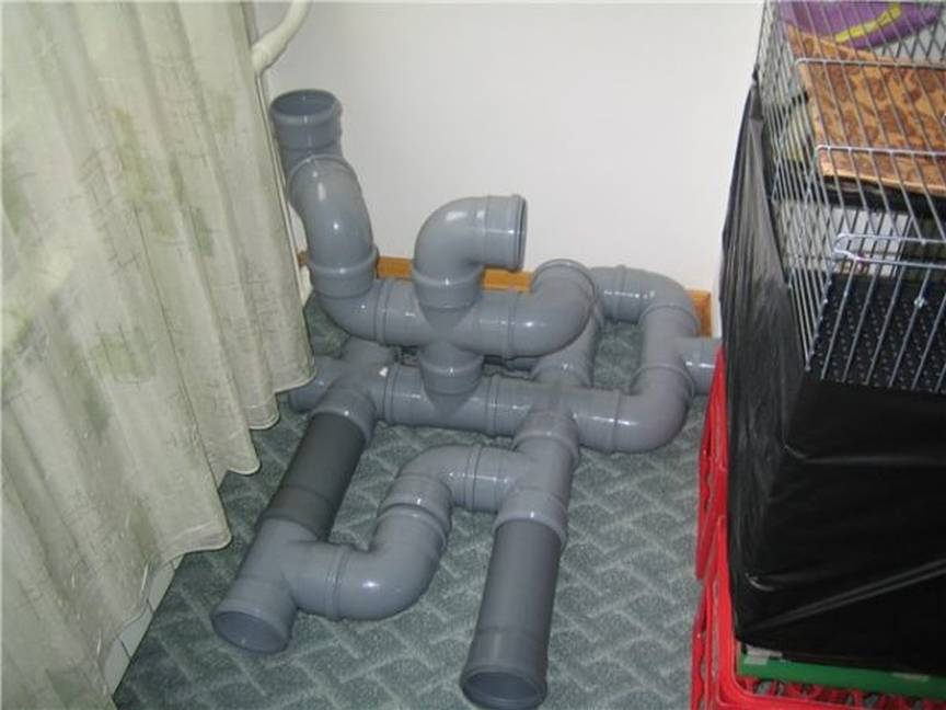 Пластик для сантехнических нужд безопасен для зверьков, он не выделяет токсичных веществ, его легко обрезать до нужного размера, несложно подобрать нужный диаметр, чтобы конструкция не занимала много места. Использовать можно любые трубы: серые и прозрачные, прямые и гофрированные, тройники и угловые детали для труб. Создать можно как одинарный туннель, так и двухуровневое сооружение, главное — не забыть проделать вентиляционные отверстия. Подытожим: чтобы обеспечить своему питомцу ежедневные полезные для здоровья тренировки многого не нужно. Немного свободного времени, фантазии, умение пользоваться ножницами и клеем — и ваш подопечный обеспечен весёлым времяпрепровождением.