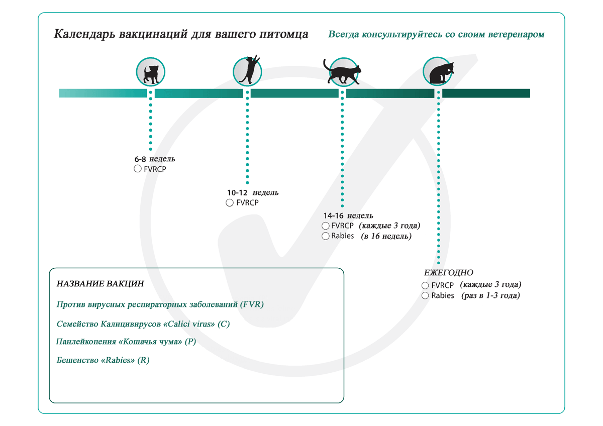 | Бешенство | 2 месяца | 3 месяца | Каждый год | Обязательная, если питомец гуляет на улице. |