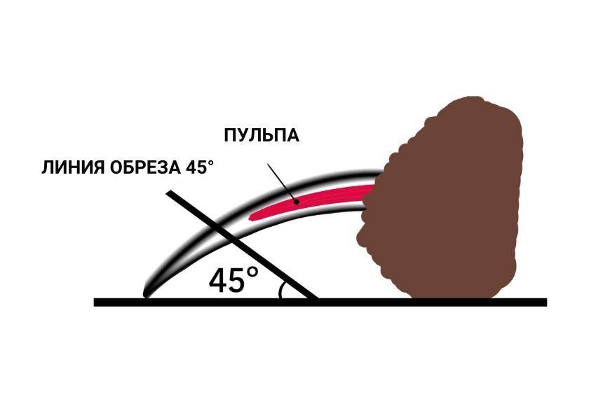 - После фиксации ногтевой пластины, вам нужно обрезать только твёрдый слой, мягкую часть не трогают. Иначе откроется кровотечение. Если вы новичок и незнакомы со строением когтей у животных, используйте инструменты с ограничителями.