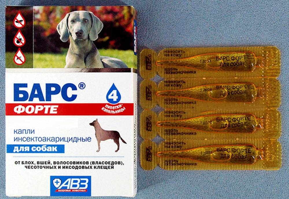 - Капли Барс и Барс Форте – выпускают для щенков и взрослых собак, выпускают в виде небольших пипеток объемом 1,4 мл. Средство хорошо и равномерно распределяется по шерсти, накапливается в волосяных фолликулах, затем постепенно выделяется наружу, что обеспечивает длительную защиту от власоедов, блох, иксодовых клещей, комаров. Разновидности капель немного отличаются составом, дозировкой активного вещества.
