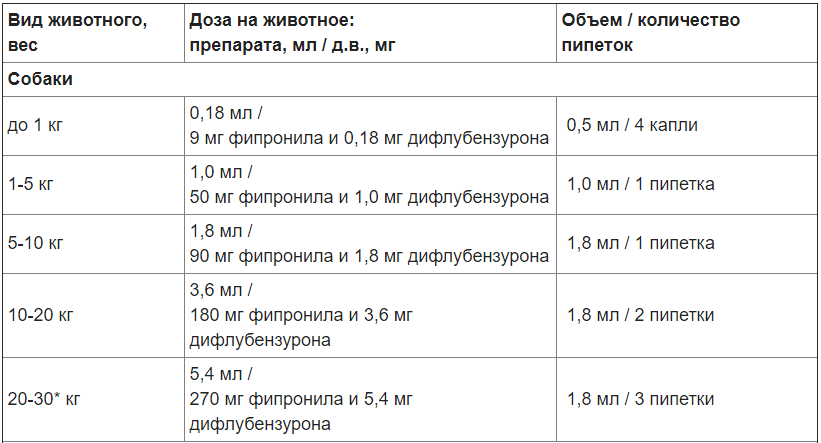 Более крупных особей обрабатывают комбинацией из нескольких пипеток разного объема, исходя из расчета дозировки по формуле − 0,1 мл на 1 кг веса животного.