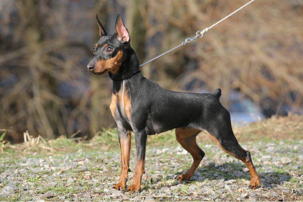 Выводить на променад цвергпинчера лучше на шлейке (эта амуниция избавляет пёсика от дискомфорта). В общественных местах и в присутствии других собак нужно очень внимательно контролировать питомца. Пёсики не только любопытны и энергичны, но и очень драчливы: маленькая собачка, не задумываясь, атакует значительно превышающего её по габаритам противника.