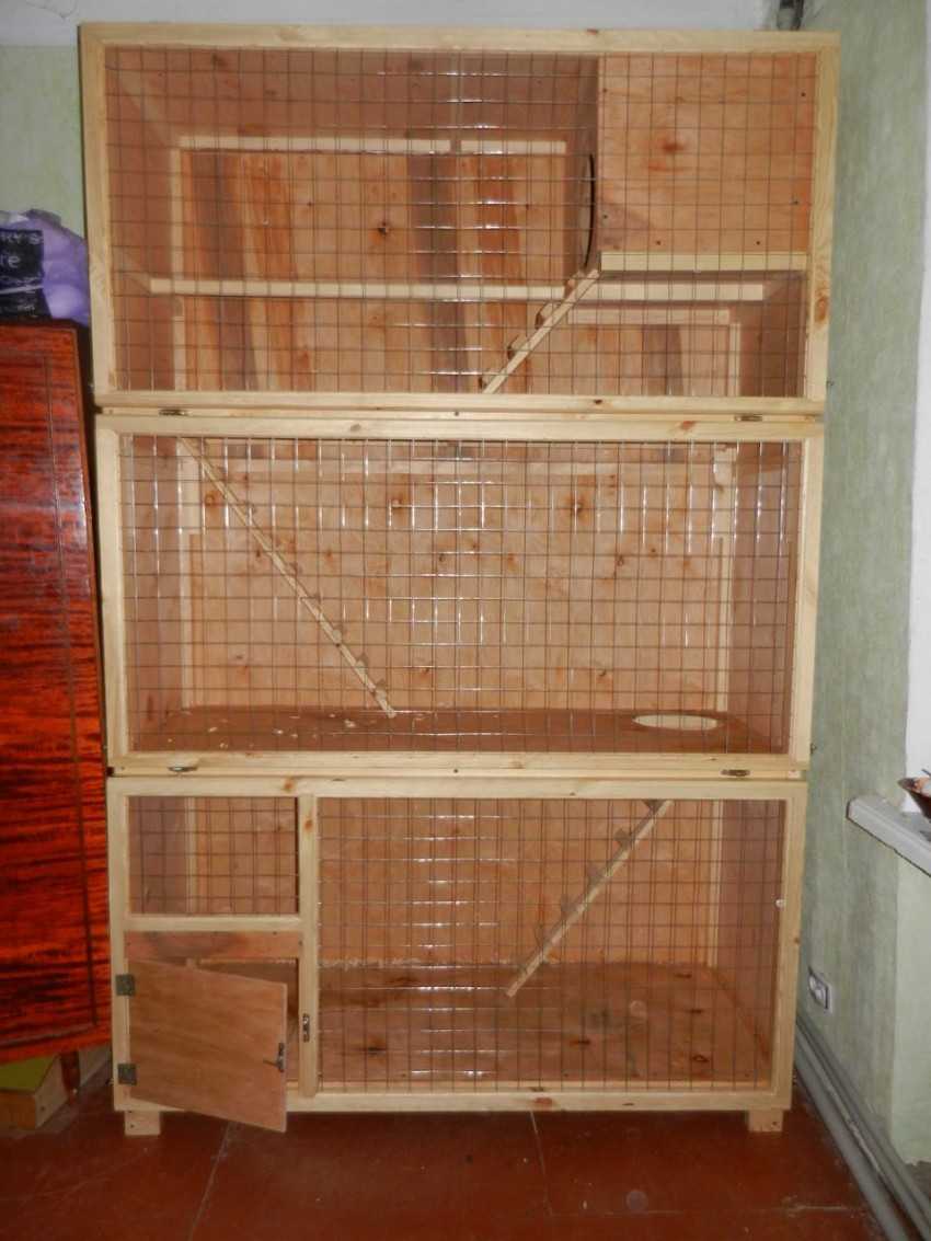 Конструкция клетки, изображенной на фото, предполагает использование максимального количества деревянных материалов, а количество металлических сводит к минимуму. В данной модели обустроено 4 уровня, на которых может обитать грызун. Кроме того, каждый из уровней имеет то или иное приспособление, создающее эффект проживания животного в вольной среде. К таким приспособлениям можно отнести домик с круглым входным отверстием, подвесную лесенку, деревянный тоннель и другие.