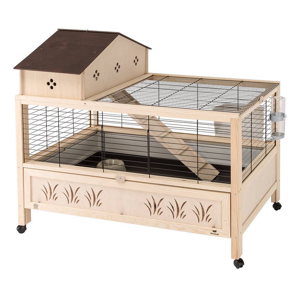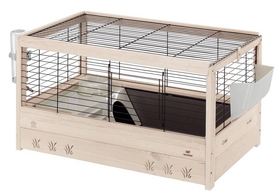 Итальянская фирма ферпласт выпускает деревянные, металлические и пластиковые жилища. Конструкция выполнена в виде деревянной основы с решетчатыми стенами, или решетчатый верх с поддоном из пластика. Прутья решетки покрыты смесью, защищающей решетку от острых зубов питомца. Модели таких конструкций оснащены полочками, пандусами, дополнительными поддоном для улицы. В клетках этой фирмы есть откидные дверцы-стенки, что облегчает чистку.