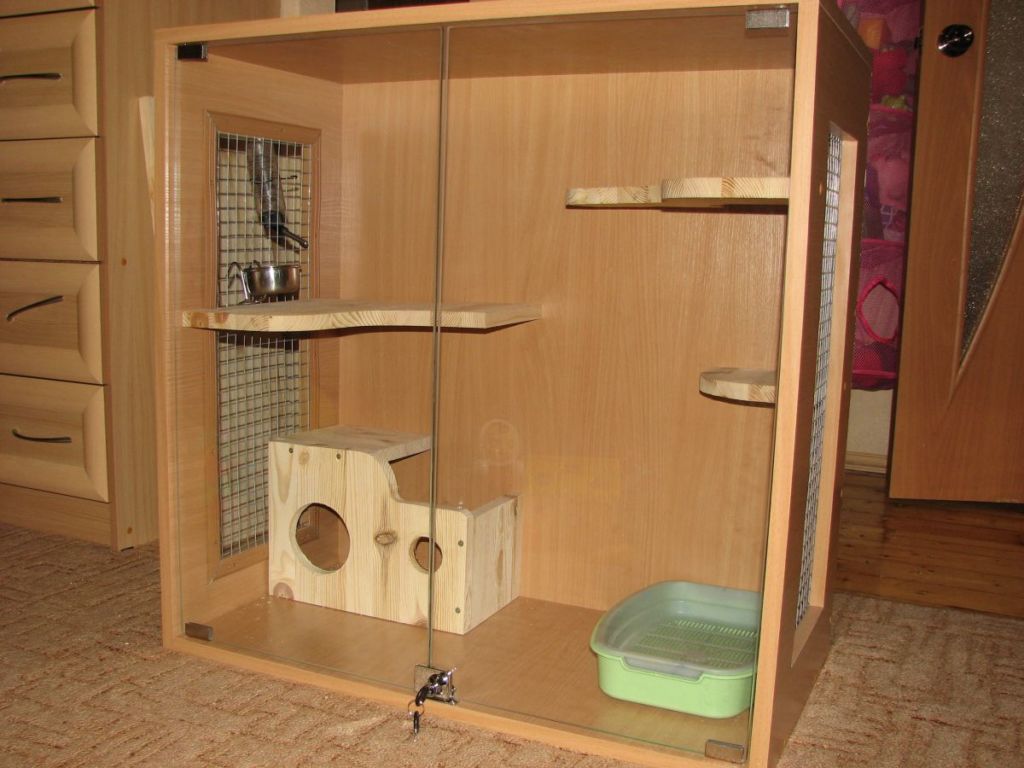 - Помимо основного вольера вам также понадобится и место, где будут храниться все вещи зверька. В соответствии с фото тумба устанавливается над вольером, а для крепления можно использовать обычные петли. Чтобы дверца от тумбы над вольером на падала произвольно, можно использовать ограничитель.