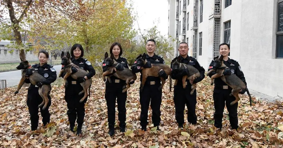 Офицеры полиции вместе с шестью клонированными щенками Фото Пекинского муниципального бюро общественной безопасности