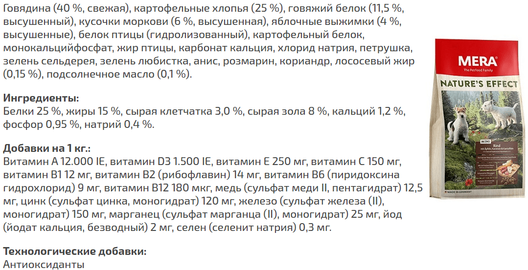 Пример состава корма Mera Pure Sensitive mini adult lachs&reis (для взрослых собак малых пород с лососем и рисом)