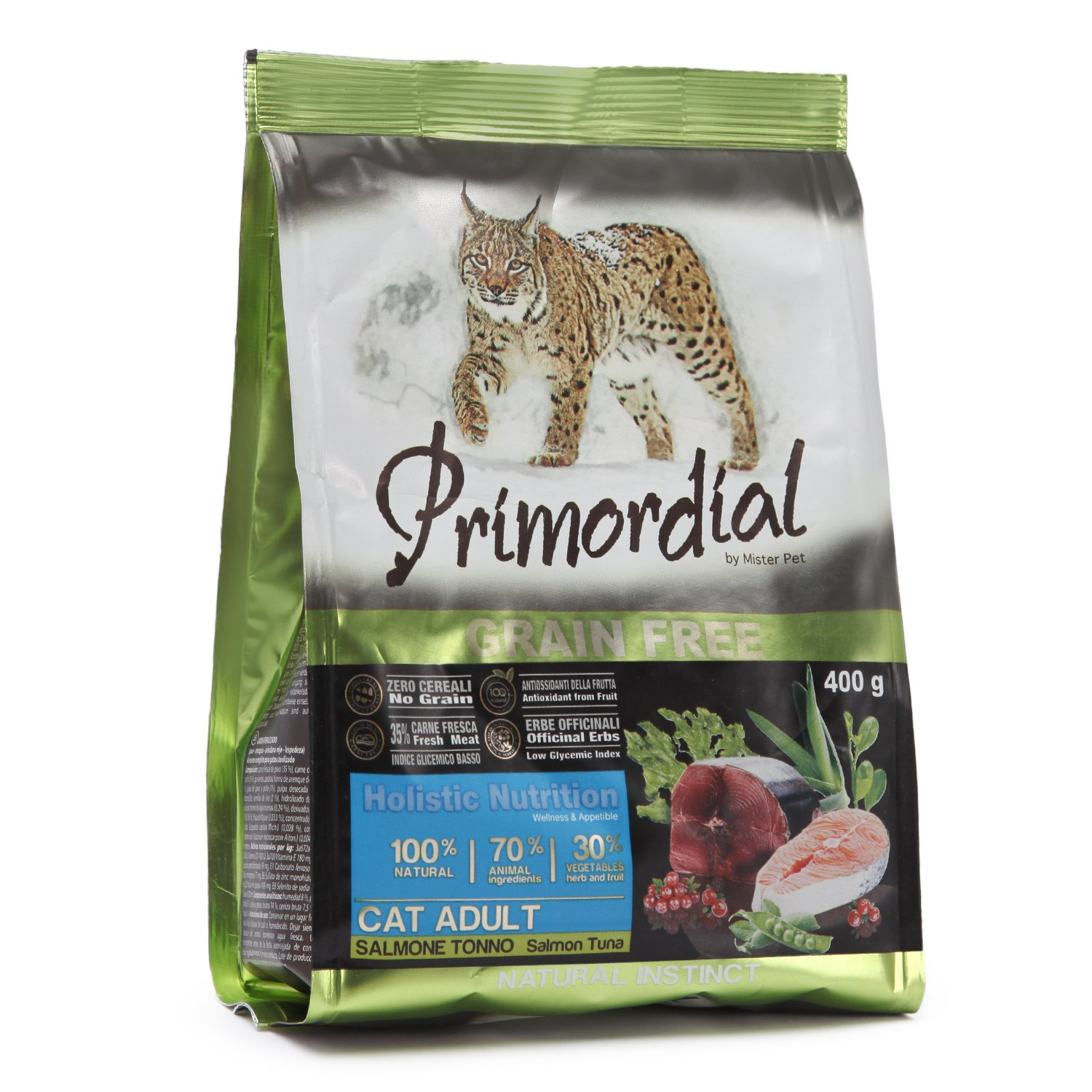 Беззерновой корм итальянского производства со вкусом лосося и тунца Primordial относится к категории супер-премиум класса (Холистик). Благодаря натуральному, сбалансированному составу, он станет отличным рационом для домашнего хищника, как если бы тот самостоятельно добывал себе пищу в диких, природных условиях. Несмотря на название и классификацию продукта, в корме всё же присутствует незначительная часть зерновых культур. Однако их процент настолько мал, что практически не влияет на вкус и аромат. Помимо натурального свежего мяса (до 70%), в составе содержатся сушеные яблоки, ананасы, водоросли, черника, гранат и ряд других растительных компонентов.