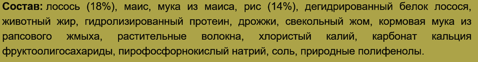 Животные ингредиенты представлены лососем. Значительная часть протеина поступает за счет растительных компонентов – кукурузного глютена (переводчик назвал его маисовым белком) и порошкообразного рапсового жмыха.